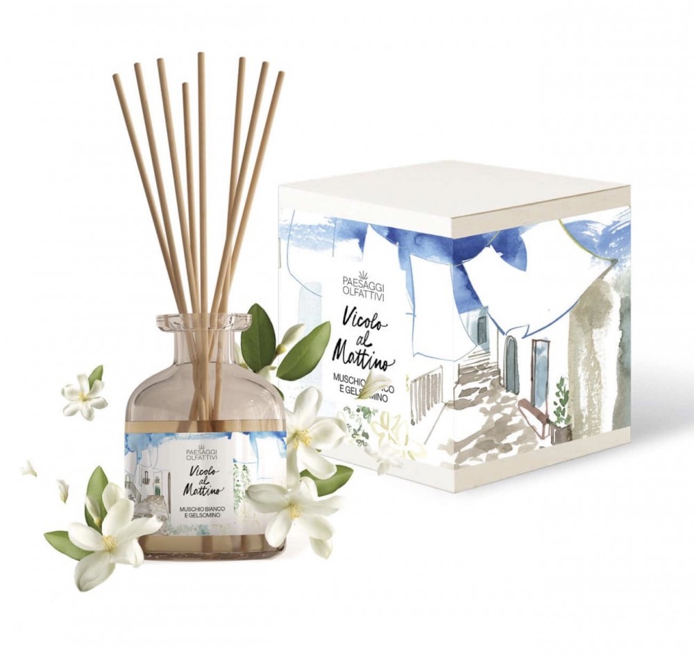 Evoque une atmosphère fraiche et lumineuse, typique d'une ruelle ensoleillée aux premières heures du matin.