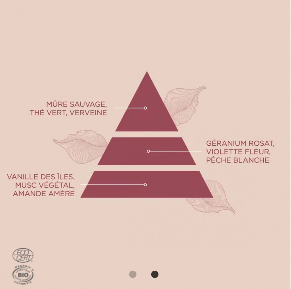 Au départ, la fragrance révèle une tête fraîche et fusante de mûres sauvages et thé vert avant que son cœur au duo floral géranium-violette trouve son point d’équilibre aux côtés de la pêche blanche. Vient alors s’exprimer un fond délicieusement musqué, où la vanille solaire et l’amande amère rivalisent de douceur et de sensualité.